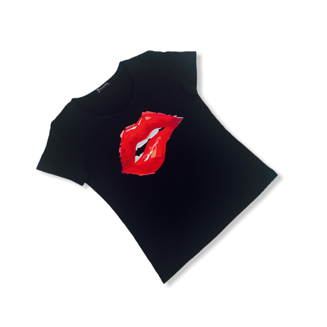 Dámské tričko černé barvy s elastanem .Tričko je užšího strihu , elastické a má stylový potisk ,který dodáhne tričko k dokonalosti.